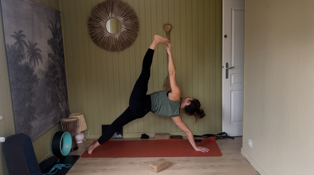 Bienvenue dans ce 21 jours legs challenge. C’est parti pour le Day 10 avec un focus sur la posture Vasisthasana. Adaptez toujours les postures en fonction de vos possibilités. Vous aurez besoin de 2 briques (ou livres) et une sangle ainsi l’aide du mur.