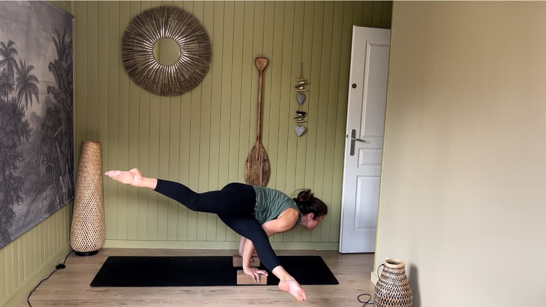Bienvenue dans ce Programme pour apprendre les 13 Arm-balances phare du Yoga. Ce programme est dédié à tous ceux qui souhaitent se challenger, changer de perspective et découvrir l’équilibre sur les mains. Cette sixième cours de 55min vous permettra de travailler avec des exercices ciblés pour préparer le corps à la pratique des arm-balances et explorer le tout sixième arm-balance : Eka Pada Koundiyasana 1. Il s'agit d'un arm-balance avec les jambes en écart comme des ciseaux avec une torsion. Je vous invite à utiliser les blocs pendant le cours, qui vous aideront pour travailler vos postures. A travers une échauffement du corps avec un flow pour préparer le corps intelligemment, poser les fondations, intégrer les premiers arms-balances (bakasana, side bakasana, transition tripod - bakasana ), renforcer votre force avec des exercices spécifiques pour travailler votre centre, explorer les torsions et étirer les jambes, je vous guide step by step pour explorer Eka pada Koundinyasan 1.